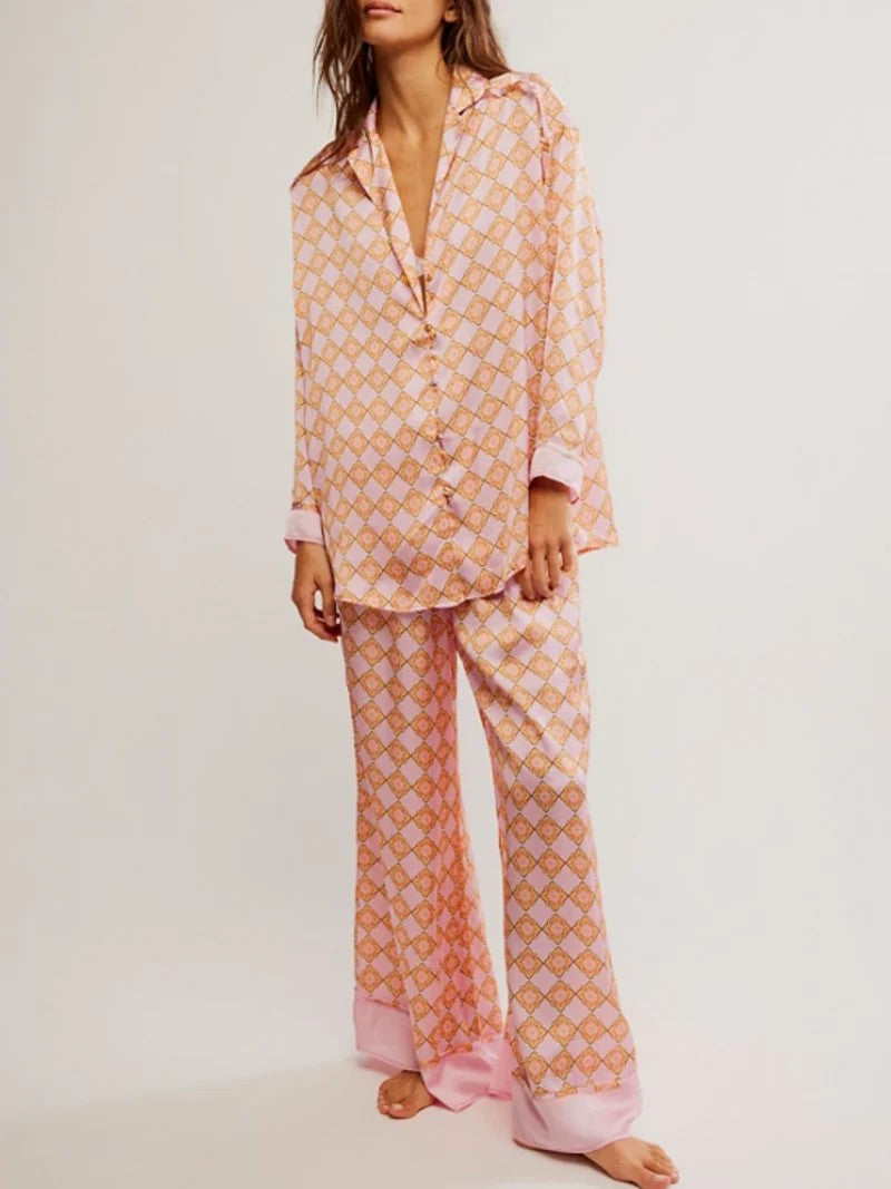 So essential pajama set featured in a soft printed fabrication and oversized silhouette with a long-sleeve top and matching wide-leg bottoms.