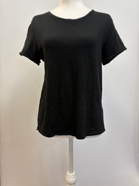 This cute and comfy short sleeve t-shirt is crafted from 100% cotton. It features a scoop neckline with raw edge sleeves and hem.