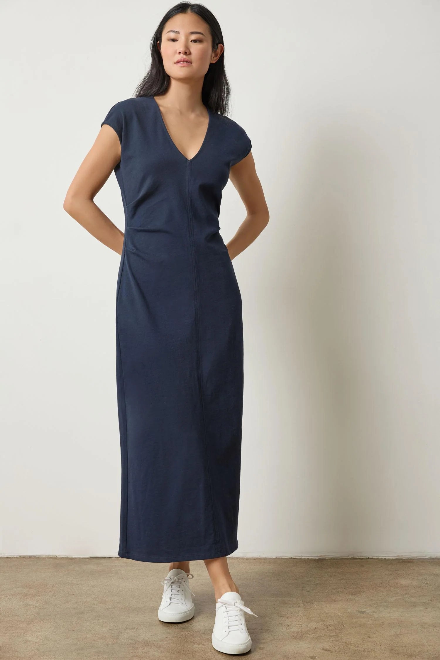 The Side Tuck Maxi Dress in our Structured Knit, a slightly heavier-weight compact jersey that holds its shape beautifully, has a straight fit with just the right amount of ease. Side pleats add subtle detail and create a flattering shape, complementing the simple V-neckline. Effortless yet polished, this dress is a refined staple you'll reach for season after season.