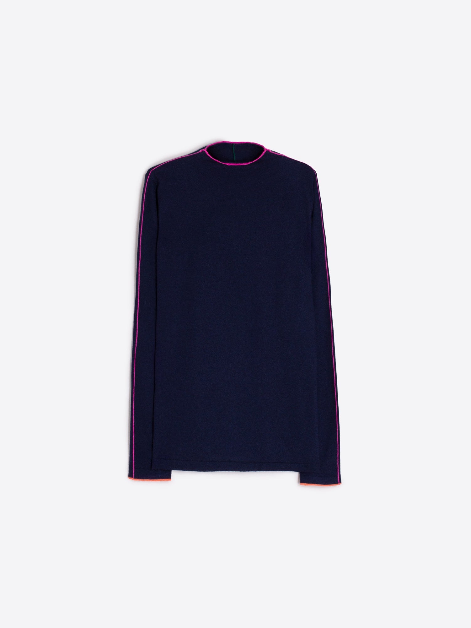 Navy high-neck sweater with contrast trim in bright pink along the neckline, sleeves and shoulders, and a central green line down the back. Straight fit with straight hem and long sleeves. Lightweight knit texture made from a wool blend. Relaxed silhouette for everyday wear.